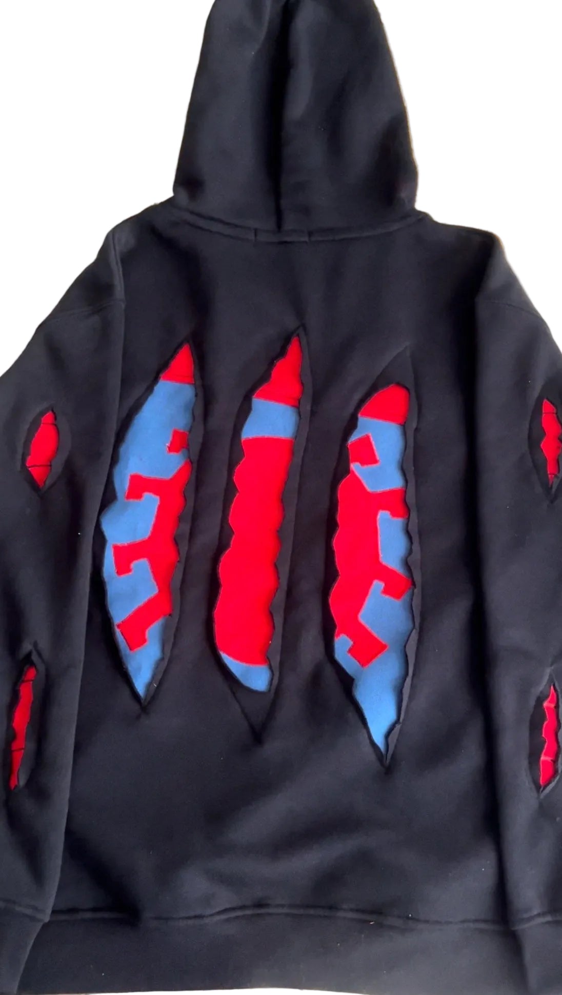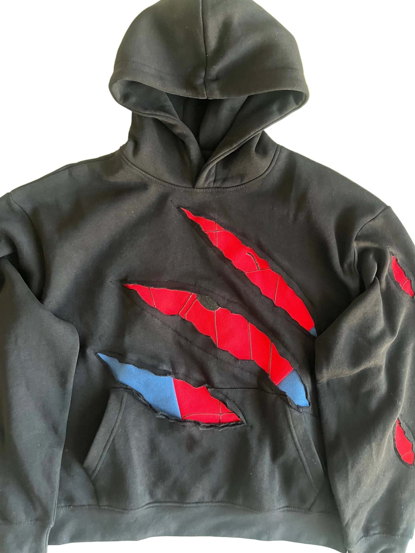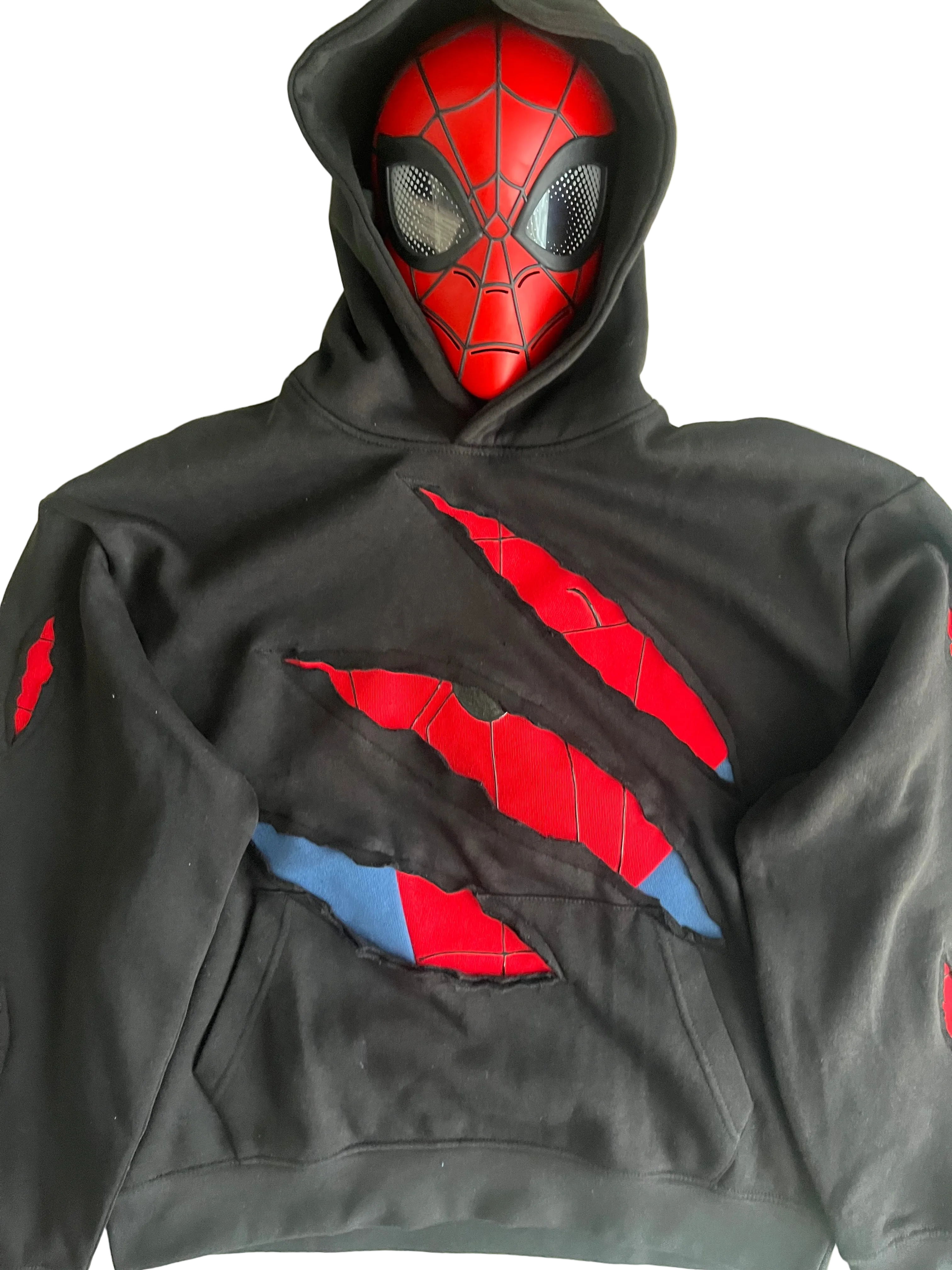 Handmade Battle-Damaged Spider Hoodie with front, sleeves and back design.