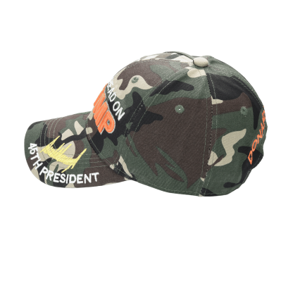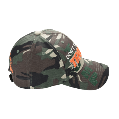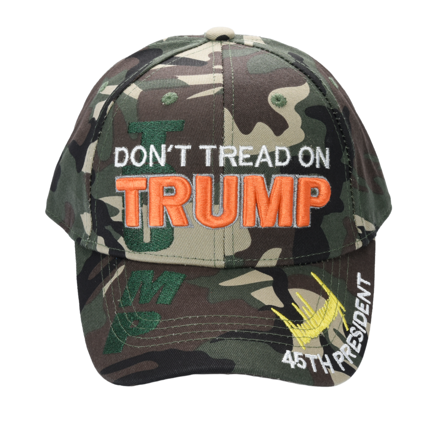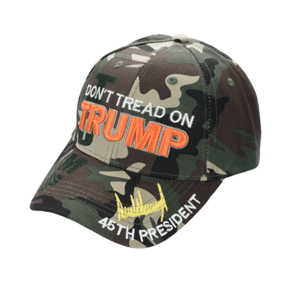 Channel strength and freedom with this bold �Don�t Tread on Trump� camo cap, featuring robust embroidery on soft, premium cotton twill. The design showcases the slogan on the front, complemented by a �45th President� detail on the bill, all set against a rugged camouflage pattern. This cap is designed for comfort, style, and statement-making patriotism.
