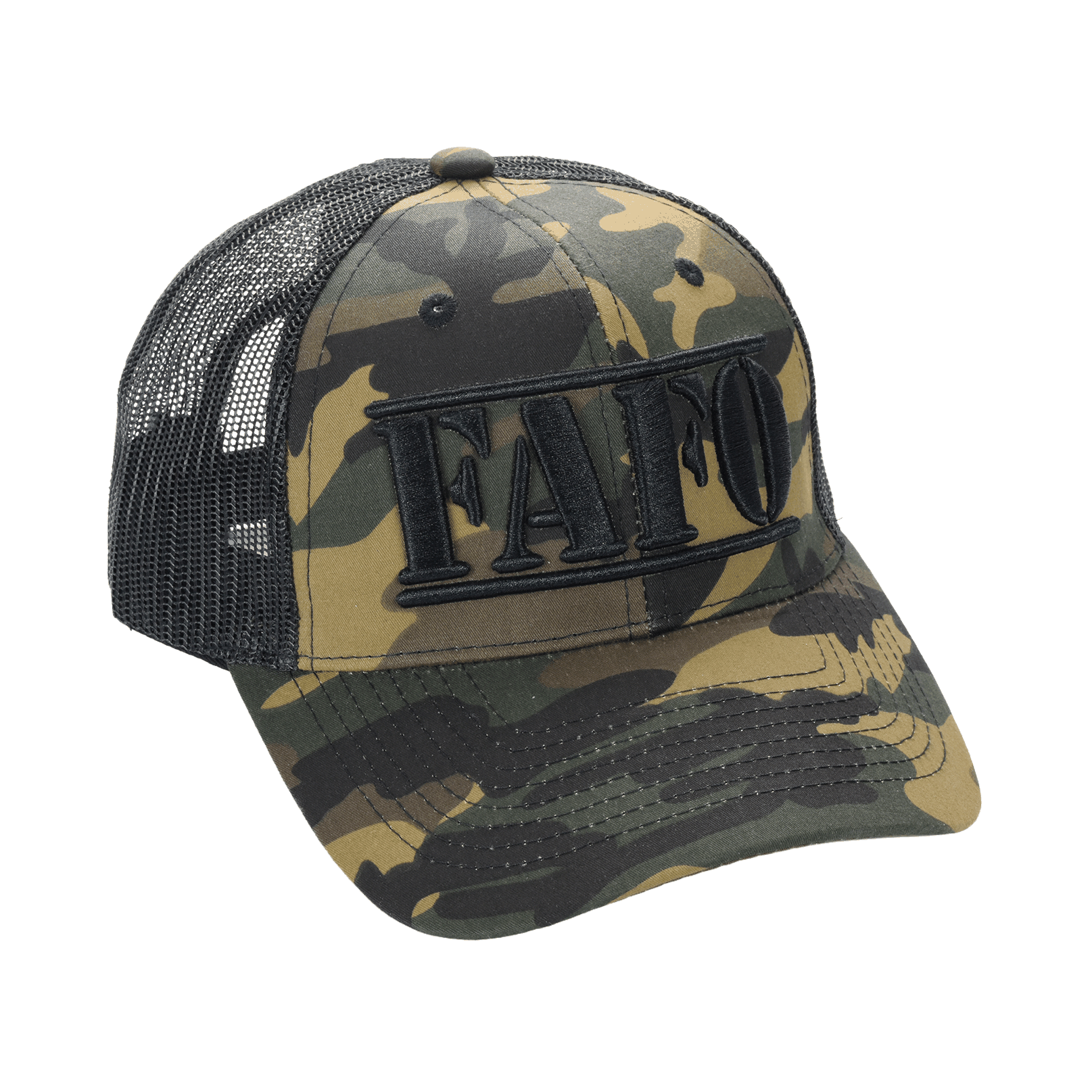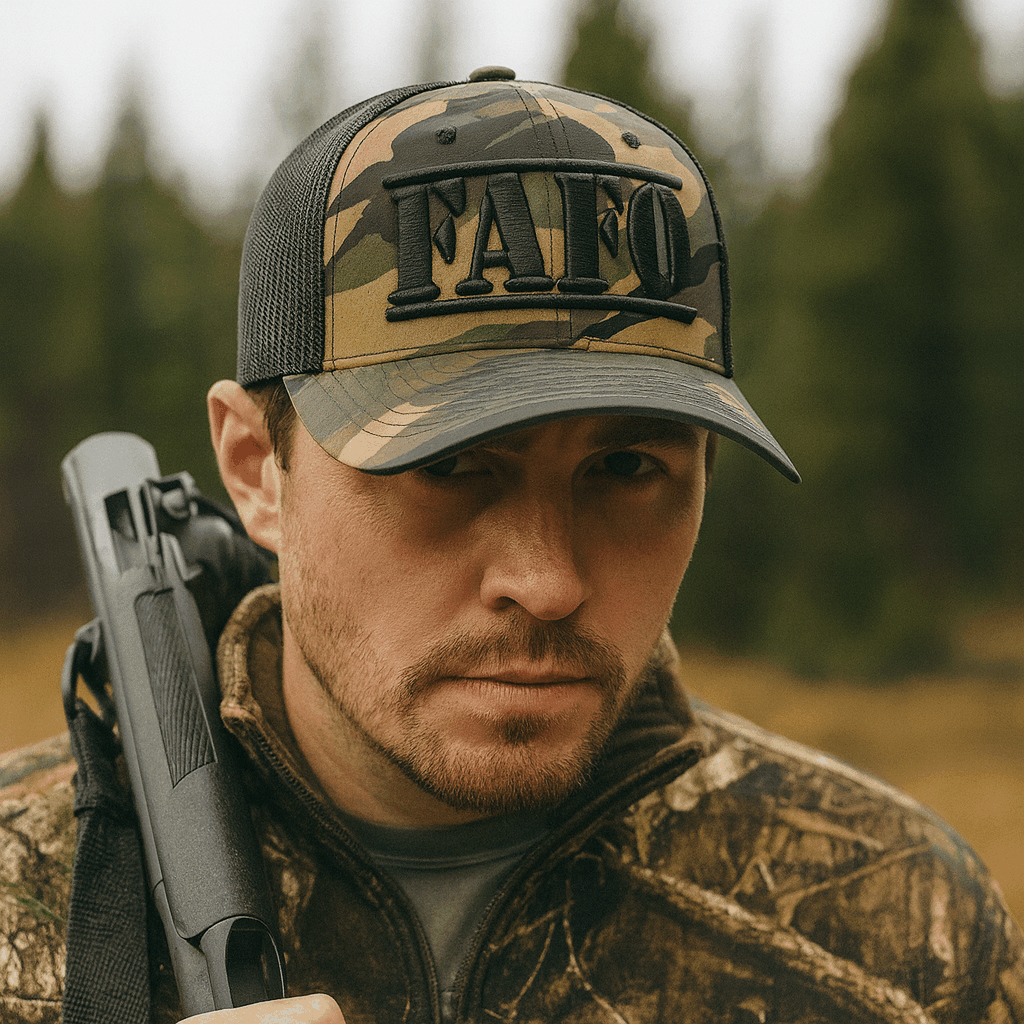The?FAFO Camo Trucker Cap blends rugged outdoor utility with a bold message. Featuring high-quality camo-patterned fabric, breathable mesh backing, and a sharp �FAFO� front�short for F*ck Around & Find Out�this cap channels a no-nonsense, tactical attitude in every detail.