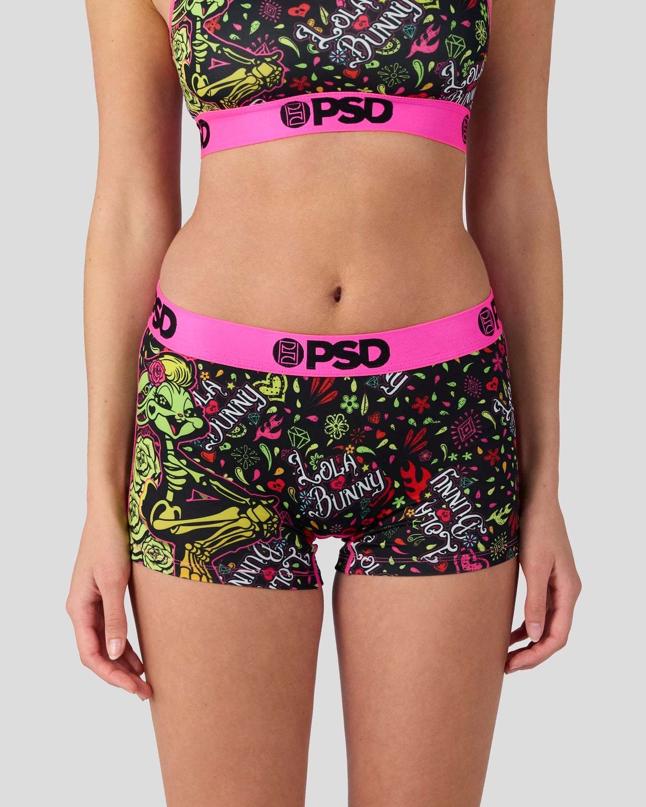 Looney Tunes x PSD gives Lola Bunny a glow-up for Día de Los Muertos. The Lola Muerte Boy Short is made from a silky poly blend with a comfortable full coverage, keep-you-in fit. The PSD boy shorts are perfect for everyday wear and working out.