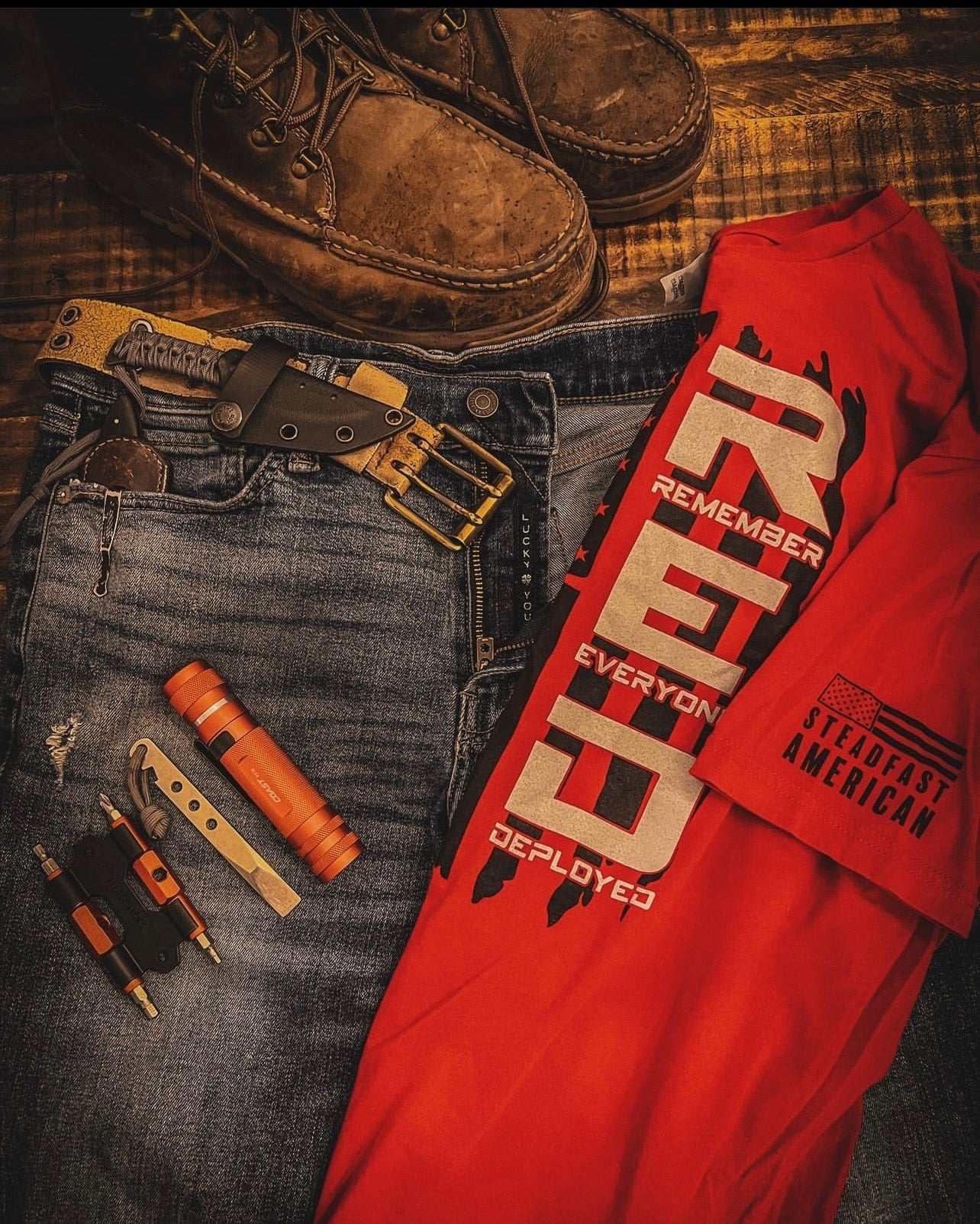 • Remember Everyone Deployed Steadfast American Logo Screen Print on Left Sleeve