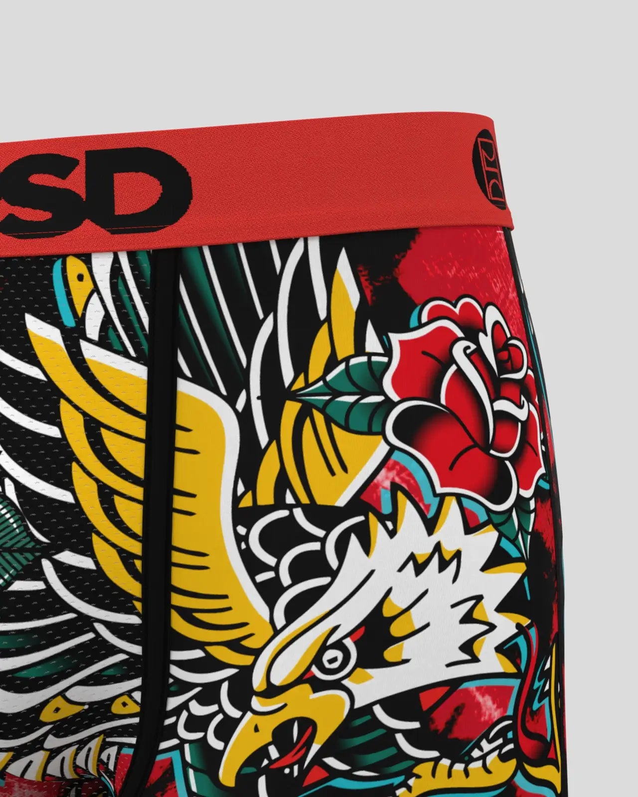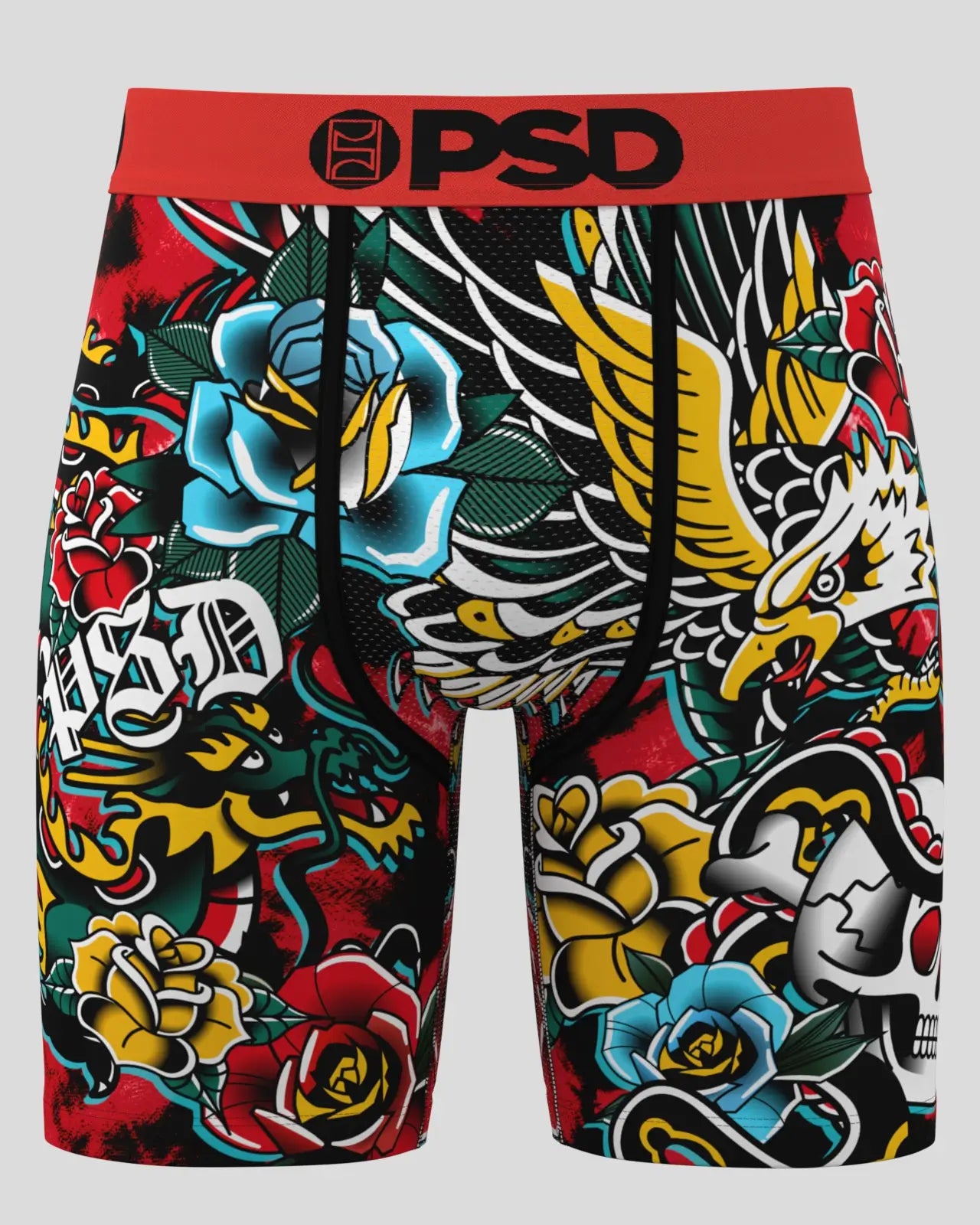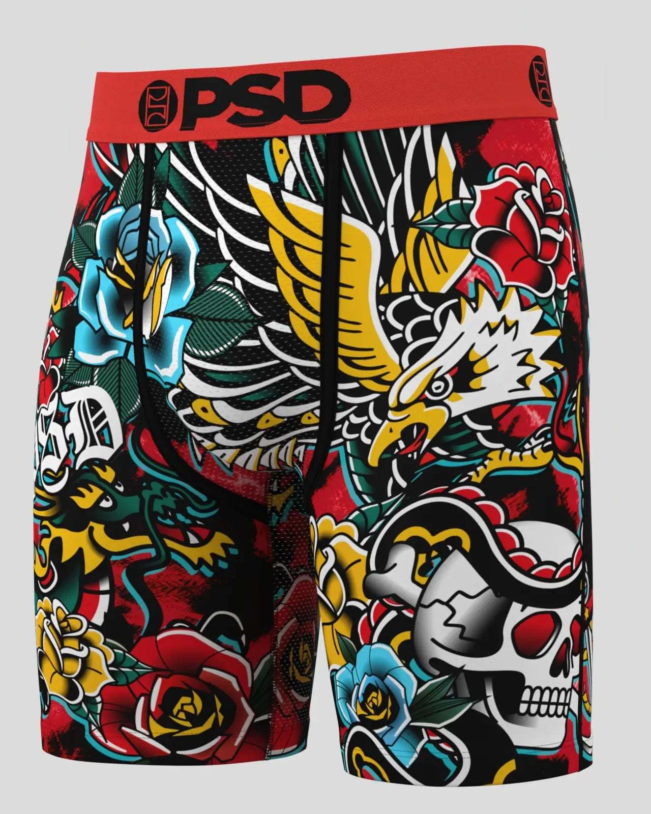 Featuring a vintage tattoo-inspired design, the Winged Spirit briefs include our ultra-comfortable Signature WaistBand, a breathable MicroMesh pouch, and four-way stretch. The PSD 7” Standard Length Briefs won't roll or ride and were built for everything, from everyday wear to your toughest workouts.